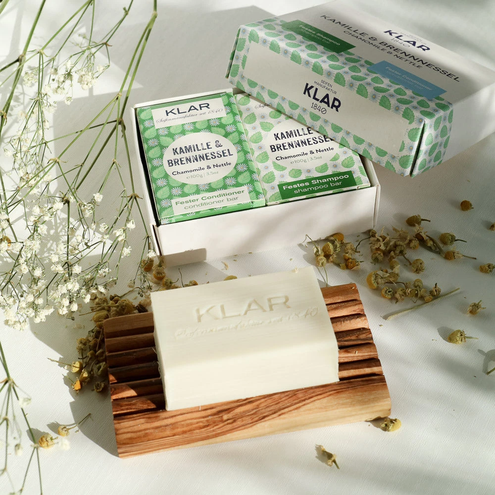 Klar’s Set mit festem Shampoo und Conditioner Kamille & Brennnessel ist das ideale Duo für sensible Kopfhaut. Die milde Kamille beruhigt juckende Kopfhaut während die Brennnessel das Haar kräftigt. Der feste Conditioner ist die passende Ergänzung und macht die Haare leicht kämmbar.