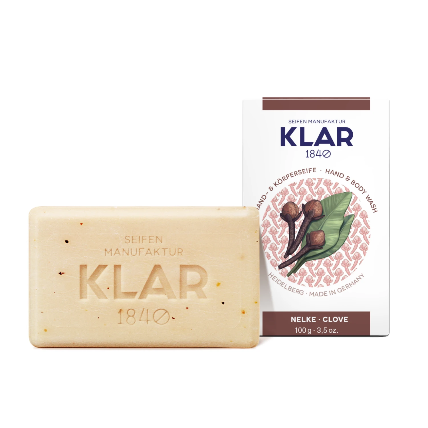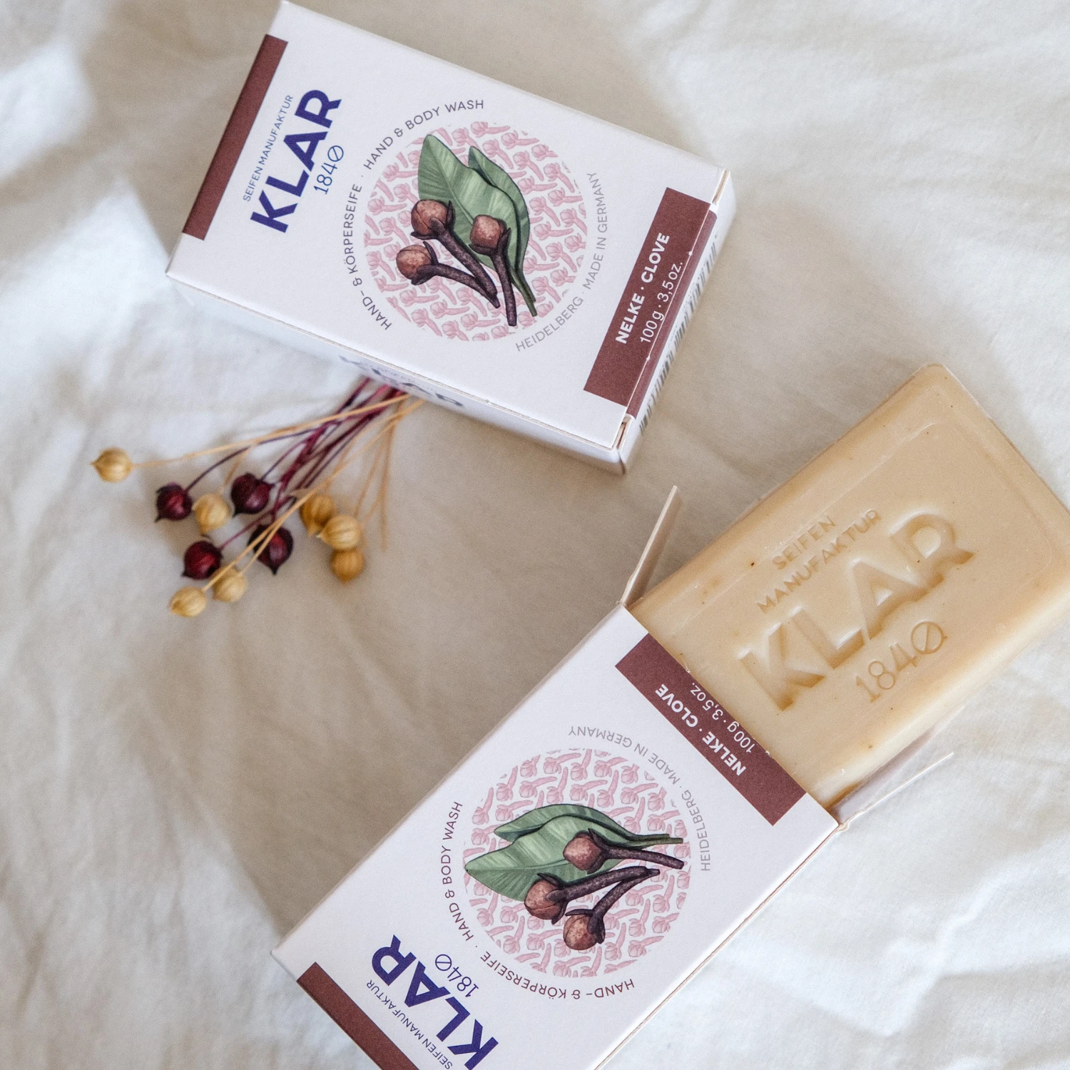 Klar’s Nelkenseife pflegt die Haut mit einem milden Schaum und verwöhnt die Sinne mit dem typisch würzigen Duft getrockneter Gewürznelken, der gegen Antriebslosigkeit wirkt. Die wundheilende Wirkung der Nelke wird seit Jahrhunderten in vielen Rezepturen genutzt.